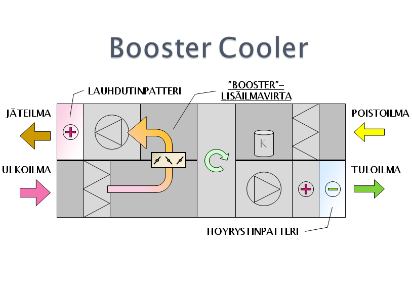 Cooler-koneissa jäähdytysteho ja kompressorin teho lauhdutetaan jäteilmaan. Käytännössä tulee usein vastaan tilanteita joissa kaikki teho ei tahdo "mahtua" jäteilmaan ja lauhtumislämpötila (ja sitä myötä lauhduttimen paine) uhkaa nousta liian korkealle. Enerventin innovaatiossa lauhduttimelle ohjataan ulkoilmasta erillisellä sulkupellillä "Booster"-lisäilmavirta, jonka avulla lauhduttimen tehoa saadaan kasvatettua. Samalla lauhtumislämpötila laskee ja Cooler-koneiden tyypilliset ongelmat käynnistyksissä ja kuumissa olosuhteissa saadaan ratkaistua. Lisäksi laitteiston kokonais-COP paranee, vaikka jäteilmapuhaltimen kasvanut teho otetaan huomioon.
